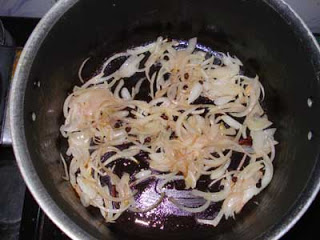 In a pan, add half the ghee and oil. Once its hot, fry the onions and the masalas until the onions are golden brown, ensure it does not burn.