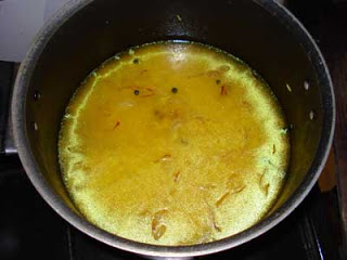 Take the pan in which rice is going to be cooked. Heat ghee, turmeric, drained rice. Fry for 2 mins.