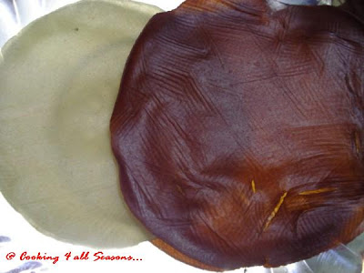 These are traditional papad made with Ragi flour. We have a Marwari family for neighbors and one day I saw the aunties tolling over big vessels full of ragi grains. Out of curiosity, asked what they are going to make. I was really surprised when I was told they were preparing papads with Ragi. They also made with Rice flour. If you ask me now for the recipe, I must confess it sounded so very complex to me what they accounted for.