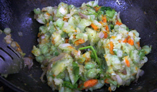 In a pan saute onions ginger garlic paste, coriander leaves, green chili paste till done. then add boiled vegetables.