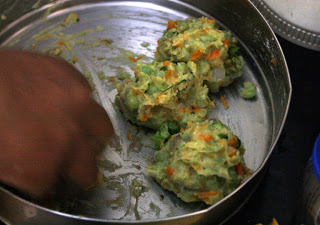 First dip the Alo batter in the Maida batter, then press over the bread crumbs till you have the tikkis are rolled up like this!