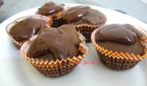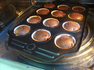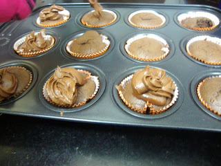 If you see that frosting is not so professional, you can say we were in a hurry! The muffins were still hot when Konda piped in the chocolate frosting and they melted right away!