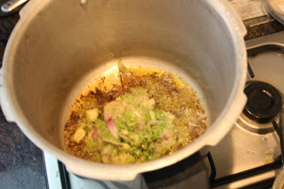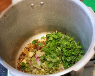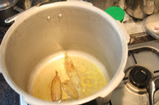 Heat a Pressure cooker with ghee, add the bay leaves, ground spice powder, saute well.
