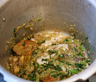 Now add the ground onion paste, saute well. Once the ground paste is sauteed well, add mint, coriander leaves. Fry on high flame well.