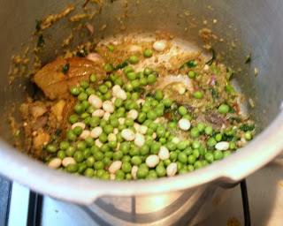 Now add fresh shelled peas, butter beans, soya, brussels sprouts saute well. Add water and bring to boil.