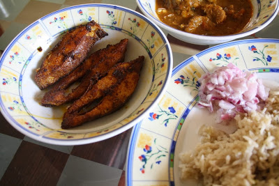 That is a mouthwatering spread of food on the table! Fried fish is very tempting.