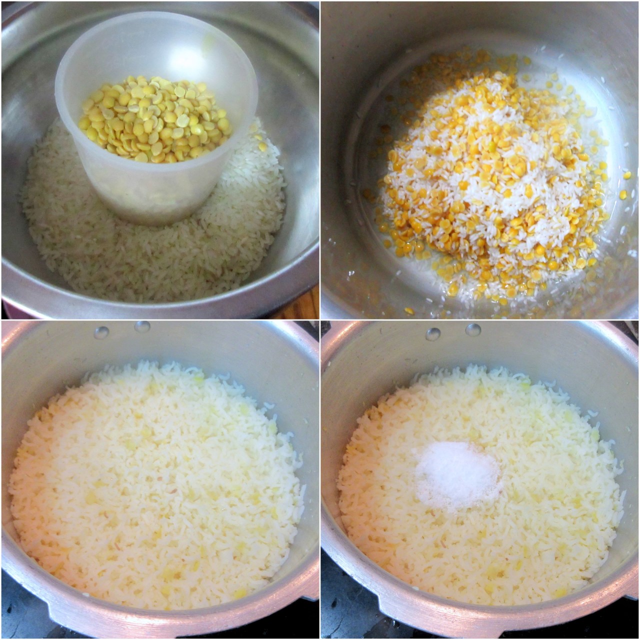 - In a pressure cooker, take the rice, dal add 4 cups of water. Pressure cook for 4 whistles.