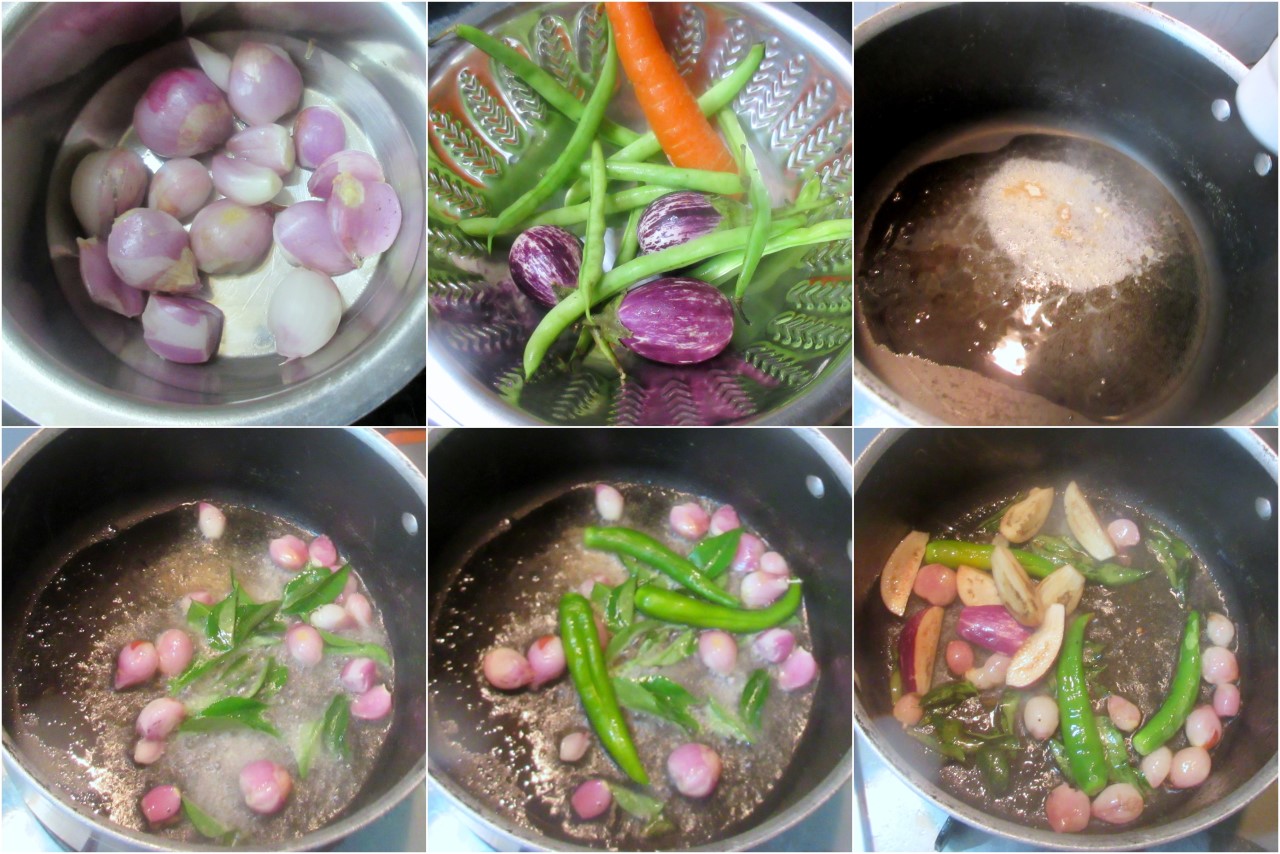 - Wash and chop the vegetables. Soak the brinjal pieces in water.