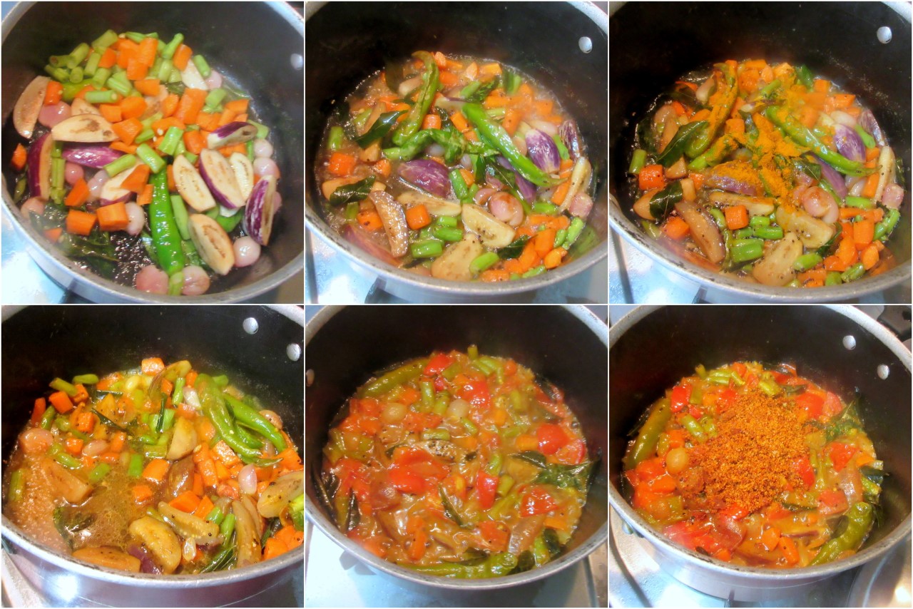 - Add the turmeric powder, 1 cup water and simmer till all the vegetables are cooked.