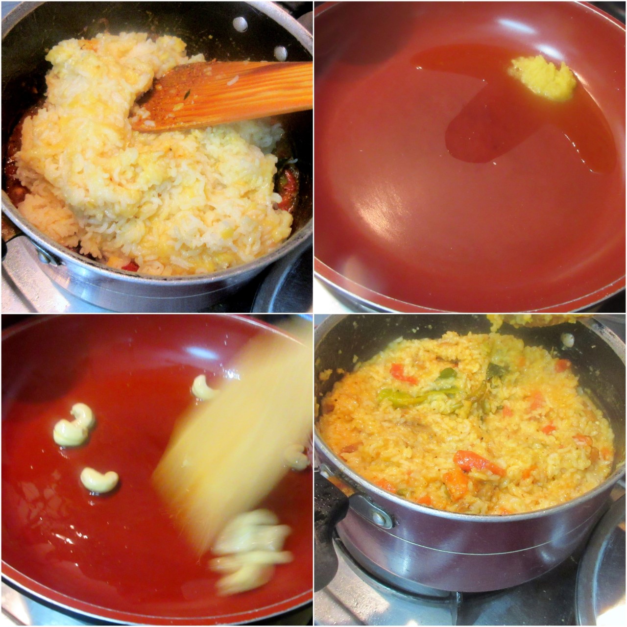 - Heat a pan with ghee and roast the cashews and pour this on the simmering sambar rice.