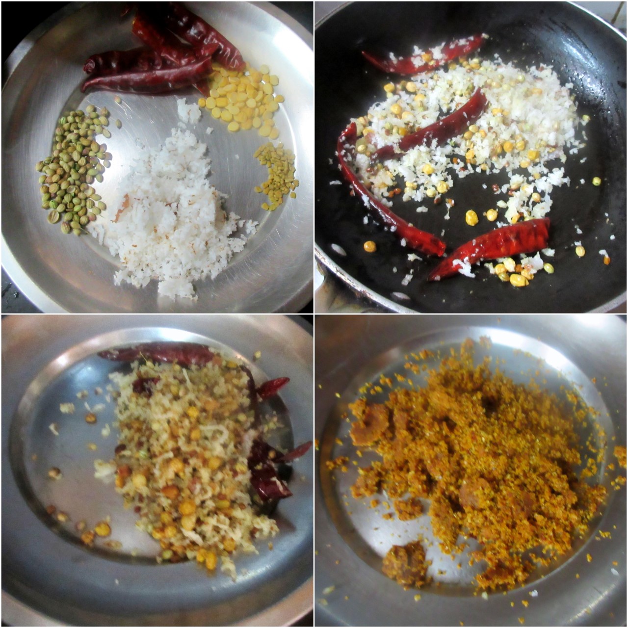 - Heat a nonstick pan with oil, roast all the ingredients for the fresh sambar powder. Remove when it turns aromatic.