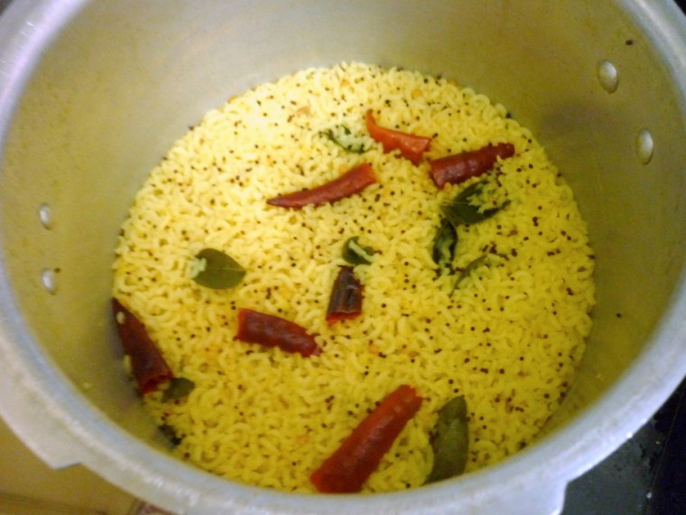 When the mustard pops, add the drain rice, dal mix and saute in oil for couple of minutes. Then measure 2 cups of water and add to the pan along with turmeric powder and salt. Mix everything well and cover with lid.