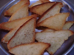 Cut bread slices into four pieces, roast in oil. Remove and keep aside. There is really no hard and fast rule for roasting the bread. You can either roast it with little oil or do a deep fry. Of course, when you deep fry it, its more tasty!