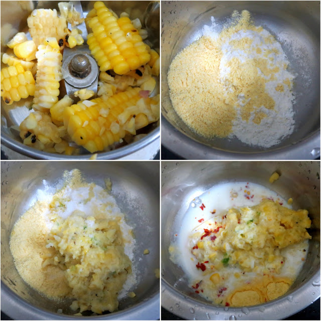 Grind the corn kernels to a smooth pulp, along with the salt and jalapenos.
