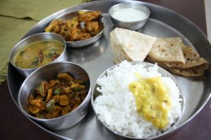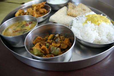 This might be traditionally Maharashtrian, but is also made by Gujaratis..no , water is not used at all, it is a dry saute..and depending on the besan used dryness of the dish can be observed.like the thali..and your obsession:)