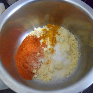 In a bowl, combine gram flour, chili powder, 1/2 tsp turmeric, salt and sugar (if adding). Do not add water.
