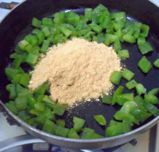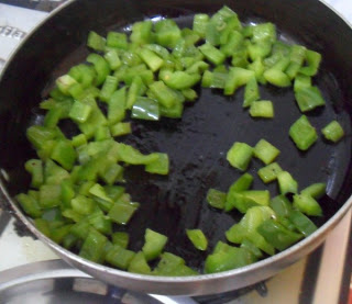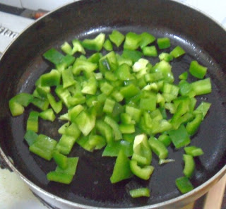 Heat oil in a non stick pan. Add mustard seeds, asafoetida. Add peppers and fry till peppers are half tender.
