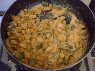 Now add gram flour and mix well until all the pieces are well coated with the flour. Fry for sometime over medium heat.