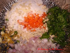 In a bowl, take the besan and rice flour along with all other ingredients. Mix well. Add more besan if needed to get a batter that holds shape. Add very little water to bind.