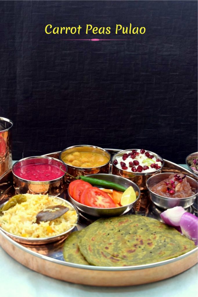 When I had planned the Rangoli Thali for the Thalis and Spreads Mega BM, I wanted a simple rice dish to pair with the gravies I prepared. So this easy carrot peas pulao was so simple to make.