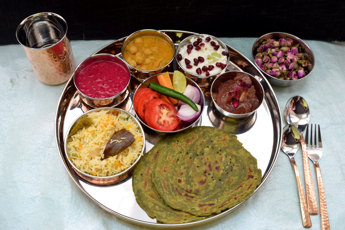 Colourful Veggie Salad, Chana Aloo Kurma for Yellow, Coriander Paratha - Green, Carrot Peas Pulao - Orange and Green with Curd Rice with Pomegranate and Grapes - White, Green, and Red. Finally to close with Rose Bombay Halwa for Pink.