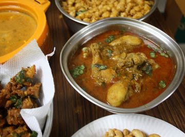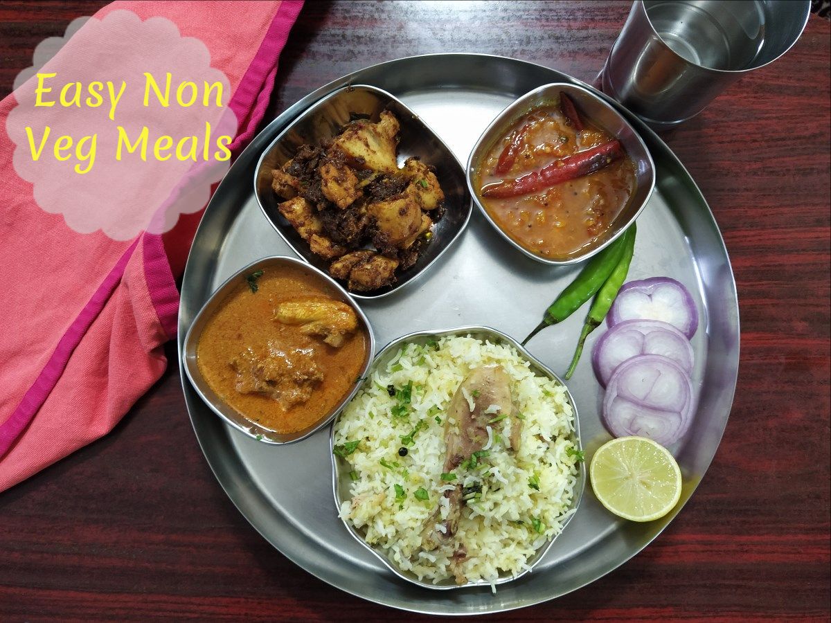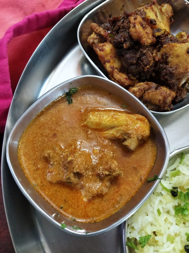 For the A to Z Easy Family Dinner Ideas, for E, though I had few more choices like Ellu Sadam etc, I resorted to showcase my easy chicken korma recipe. On the plate, I have Chittinad Chicken Varuval, Andhra Kodi Biryani, Endumirappakaya Pappu along with Curds and salad.