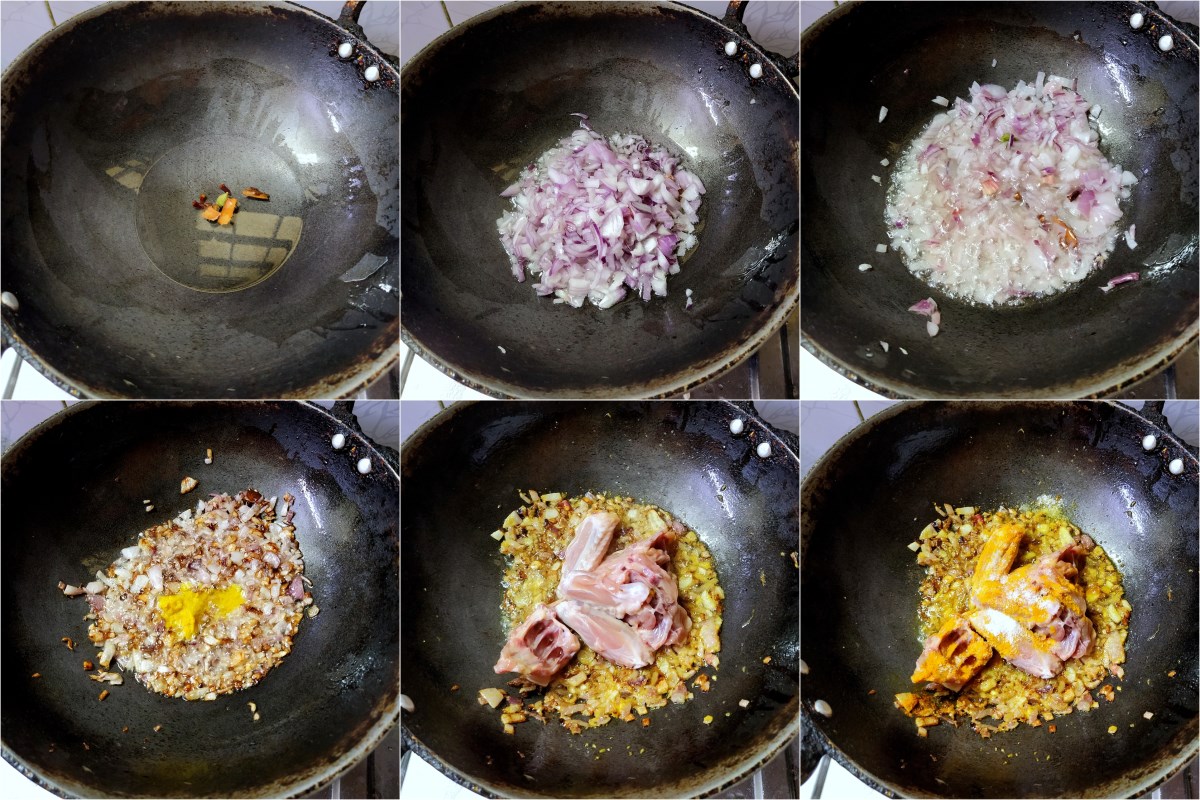 Add chicken and mix well. Next add salt and turmeric powder, simmer and cover with a lid.