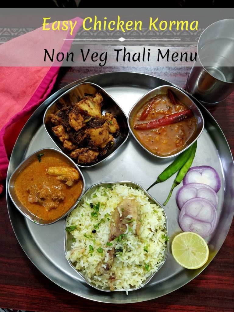 Chicken korma with coconut milk is so flavorful and delicious curry. Goes well with rice, idli, dosa, or anything. The whole platter looks so inviting
