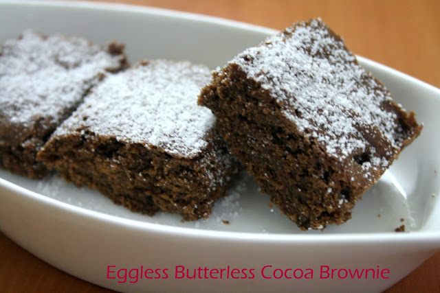 For the brownie today, I have a butterless brownie made with cocoa and nothing else. I didn't want to use any cooking chocolate and wanted to keep it simple.