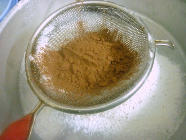 In an ungreased 8 inch (20 cm) cake pan, stir together the flour, sugar, sifted cocoa powder, baking powder, baking soda, and salt.