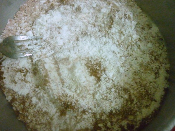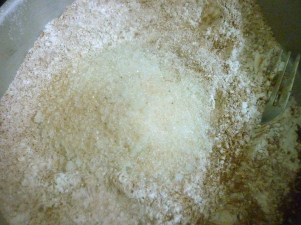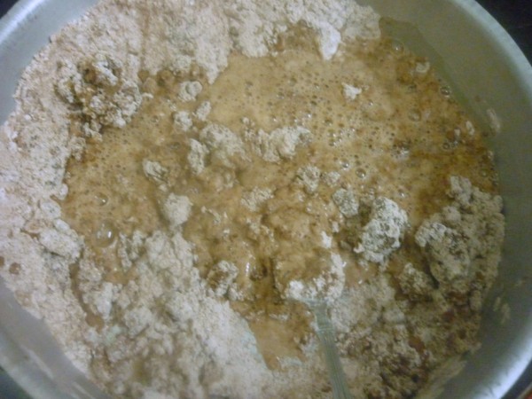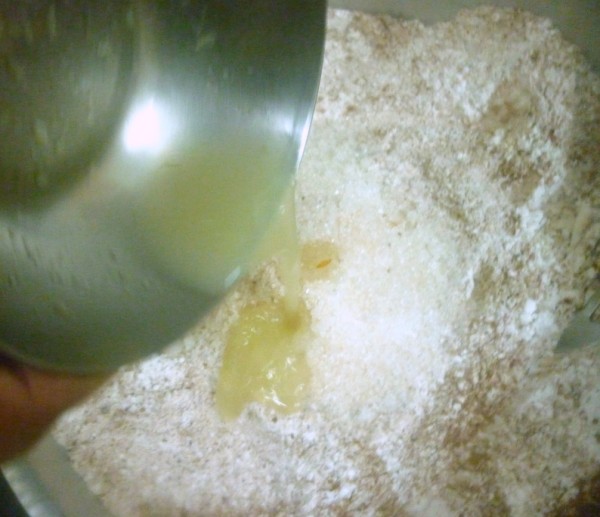 Add the melted butter, water, lemon juice. With a fork, mix all the ingredients together until well blended.