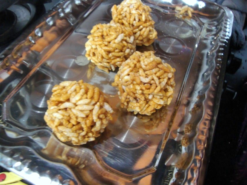 I have already posted the Pori Urundai Recipe last year. When I told Hubby dear that I am going to click pictures of the Pori Urundai that Amma was going to make, he said Amma makes it every year and I click every year!. I begged to differ saying I hadn't had a chance to record it in the right way, meaning there was no Step by Step recipe.