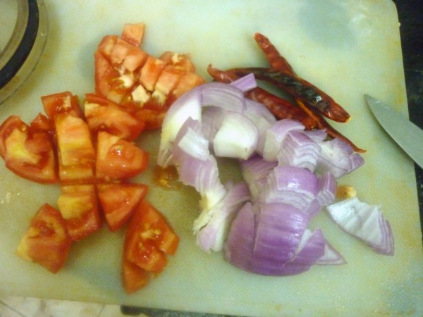 Wash, and chop the onions and tomatoes. In a mixie, take the onions and pulse it couple of times. it should become almost minced. Then add the tomatoes and repeat the process. Finally add the roasted red chilies and pulse again along with salt.