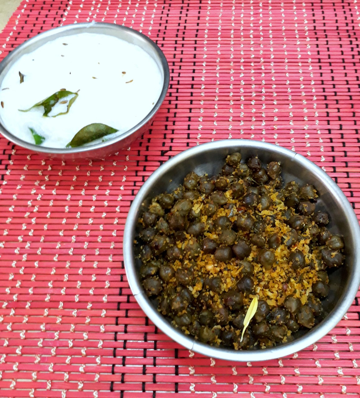 Karivepaku Kobbari Patcha Senagala Sundal is my Navratri Day 8 Neivedyam. Today's Neivedyam was this Sundal along with Curd Rice. The pictures are not touched on at all. However, the lighting in my kitchen this morning was totally weird and however much I tried, the curd Rice was turning very white.