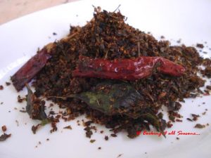 Once cool, take all the roasted ingredients along with tamarind and jaggary. Run till you get an almost a fine powder but not very fine, still not very coarse.