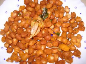 Wash groundnut in water and drain. Mix Besan, salt, chili powder and crushed garlic to the Nuts and mix well.