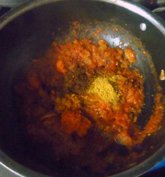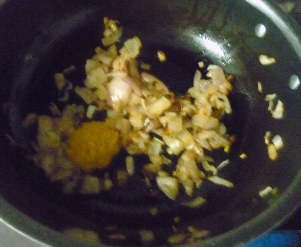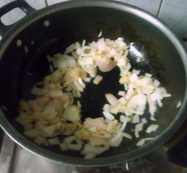 Heat a non stick pan with oil, saute finely chopped onions. When they start turning colour, add ginger garlic paste. Cook till the raw smell leaves.