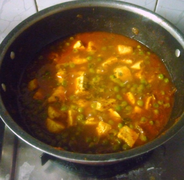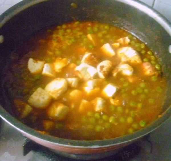 Add a cup of water and bring to boil. Then add the roasted paneer and simmer for 5 - 7 mins.