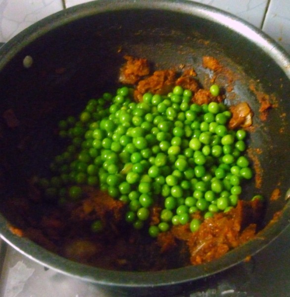 Now add the tomato puree, cook till the tomato is done. Add the spice powders and saute well. Add the fresh peas and saute well.