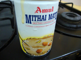 Then remove and stir well. Add sugar, condensed milk, mix well and again micro for 5 mins.