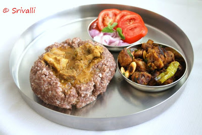 Yesterday was no different, hubby dear says we will soon become Panchayat Presidents with the number of cases these kids bring as disputes for us to solve. Breakfast was the usual affair, while lunch was to be a non veg one. Which was good because I was able to re-shoot one menu, which is very classic Rayalaseema special. Ragi Sangati with Andhra Mutton Pulusu and Mutton Roast. This is the updated picture. Check the post for details.