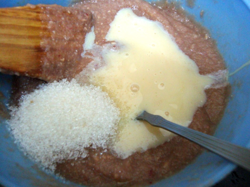 Then remove and stir well. Add sugar, condensed milk, mix well and again micro for 5 mins.