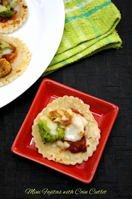 Fajita as the definition goes is a tortilla on which sizzling grilled meat is served with other condiments and fillings. I just took one part of it and made coin cutlets and served with roasted broccoli and cheese. The mini tortillas were fun to cook. Since these are mini, there is no serving control, though there is portion control. At a party, you won't really worry about that right. This will surely be a hit if you are planning to host a party for kids.