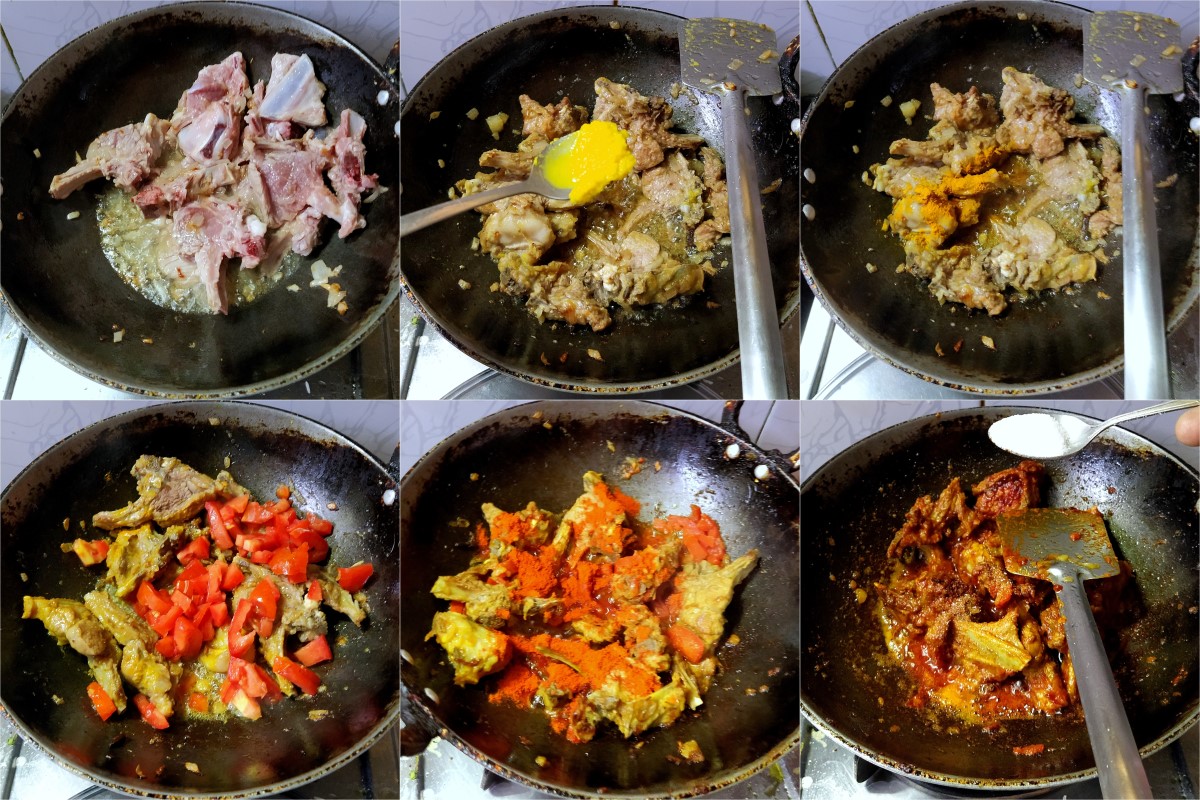 Tomatoes - The sourness and balance comes from adding tomatoes to the dry dish. The gravy is cooked until the water evaporates and everything coats the chops well.