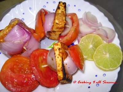 Cube the paneer into 4" squares with 2" width. Chop the onions vertical, remove the bulb in middle and separate each layer. Cube the tomatoes into 4 halves, scoop out the pulp from inside. You can use that for any gravy that you are preparing on the side.