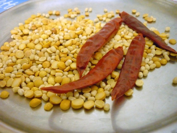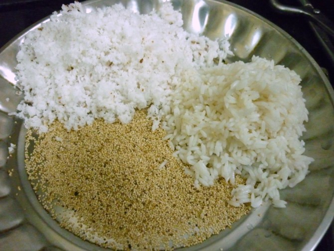 Dry roast all the ingredients till the lentils start smelling good. Remove and allow it to cool. We mostly roast these ingredients separately but when pressed for time, roast them together, making sure none get burnt or over roasted.