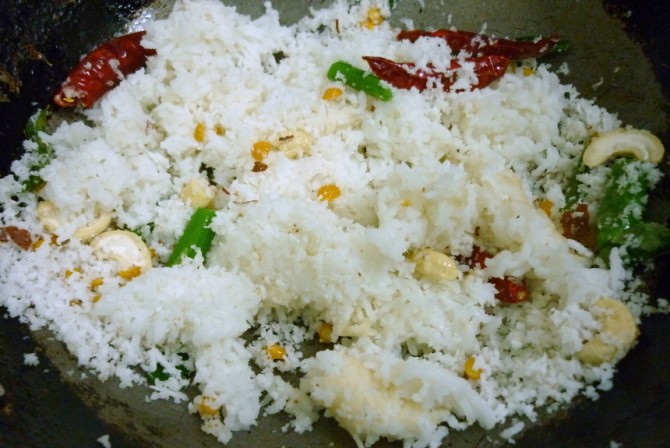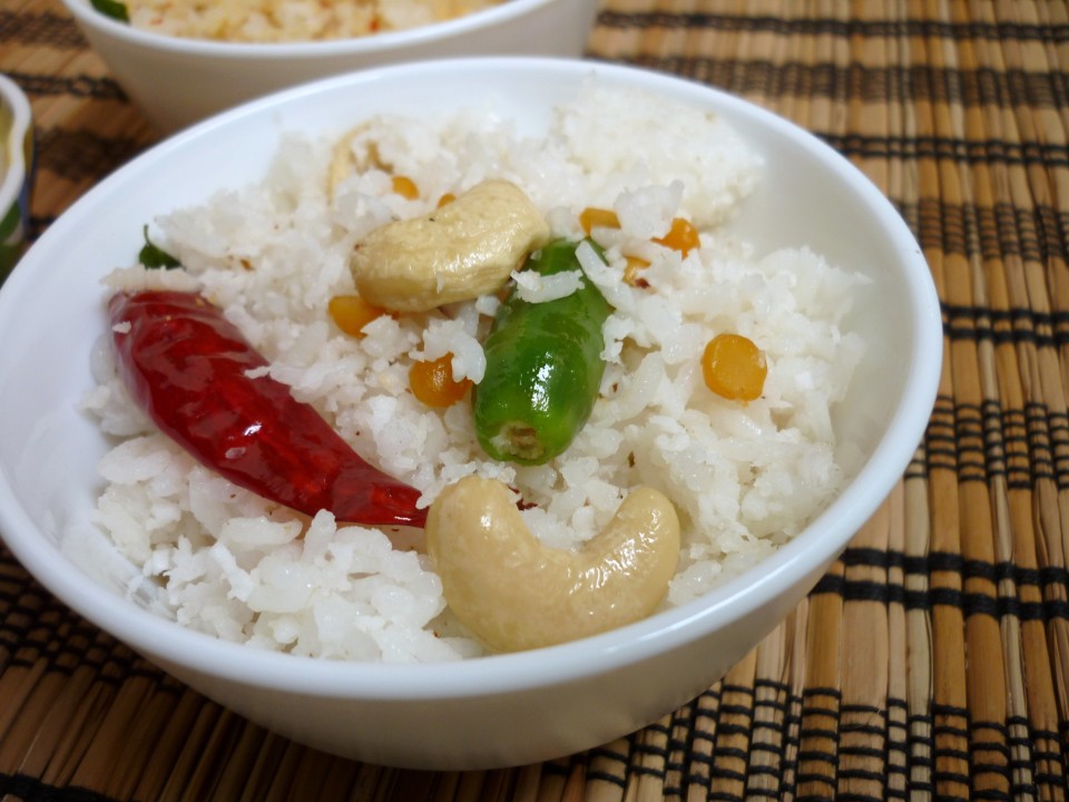 Heat a non stick pan with oil. Once hot add the mustard, urad dal, cashew, red chilies, curry leaves. Saute well. When they are sauteed for couple of mins, add the cooked rice and mix well. Simmer for 2 mins and remove to a bowl.