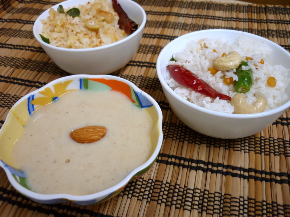 The third dish was the traditional Thengai Sadam. I love Thengai Sadam and have been missing it as I hardly make it these days. Hubby dear doesn't like it and well naturally if 1 out of 2 doesn't prefer a dish, makes no sense in bothering to make it. But today it is different, as it's to be offered as neivedyam, one can't say no for it.
