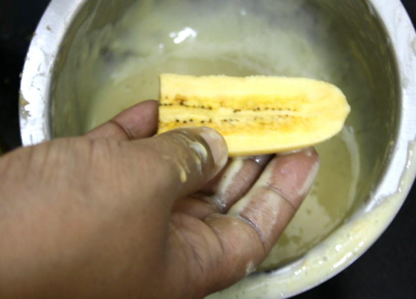 Heat kadai/pan with oil. When it is hot, dip the banana strips into the batter on both sides and gently drop into the hot oil. If the banana/plantain is over ripe, it will slip very badly, so got to hold it tight!