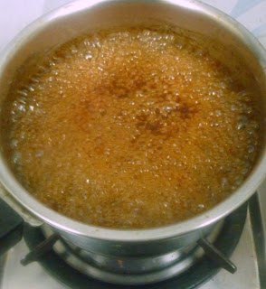 In a pan, take the tamarind water and bring to boil. Continue boiling till it becomes little thick. Add the jaggary water and continue cooking.